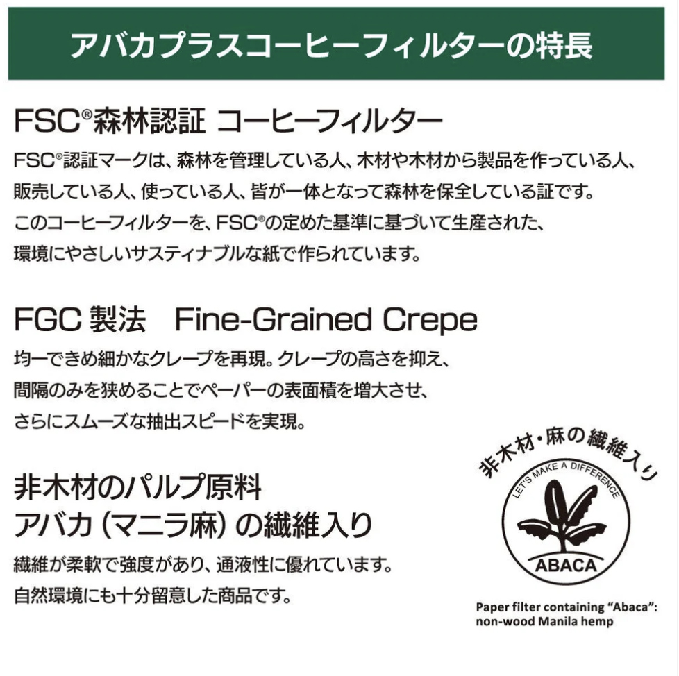 アバカとは、一般的にマニラ麻と呼ばれるフィリピン原産の多年草の植物です。アバカから採られる繊維の細さは、針葉樹の半分ながら、その強度はなんと木材パルプの4倍。このしなやかで丈夫なアバカのパルプをペーパーに混ぜることにより、通液性に優れたコーヒーフィルターが完成しました。